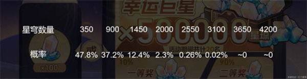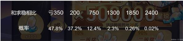 这意味着每个玩家抽中50万星琼的概率是20万分之一。从理论上来说,这个概率非常小。