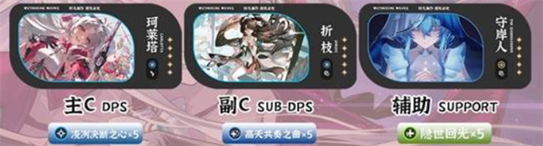 这是目前珂莱塔最强的配队之一。折枝的延奏技能可以为珂莱塔提供冷凝增伤和技能增伤,大幅提升珂莱塔的输出能力。守岸人作为辅助角色,能够为团队提供额外的防御和控场效果,确保珂莱塔在战斗中能够稳定输出。守岸人的保护作用让珂莱塔能够更好地发挥其强大的攻击力,而折枝的增伤效果则确保了珂莱塔的持续输出能够对敌人造成更大伤害。