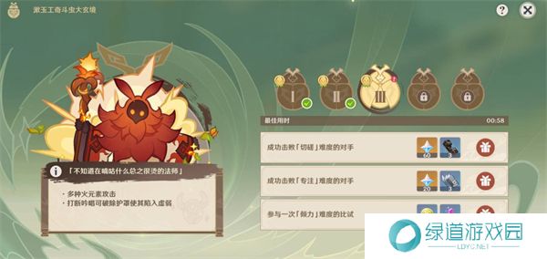 在原神5.3版本新增的“漱玉工奇斗虫大玄境”挑战中,第三天的斗虫对手是一个不知道在嘀咕什么总之很烫的法师。一些玩家很难在此挑战中获得全部奖励,因此为了帮助大家更加容易拿到全部奖励,以下是详细的原神漱玉工奇斗虫大玄境第三天如何拿满奖励的攻略,希望能对你有所帮助。