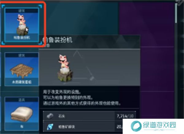 在建造界面中选择制造帕鲁装扮机。制造完成后,帕鲁装扮机将出现在你的建筑界面中,随时可以使用。