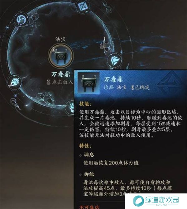 万毒鼎:适合想要走高输出的路线,万毒鼎在提升伤害的同时,可能还会附带额外的中毒效果或持续伤害,增强输出能力,是输出角色的理想选择。