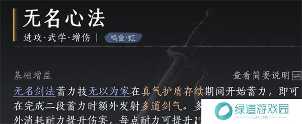 心法效果:专为无名剑法设计,能够增加蓄力后的伤害输出。