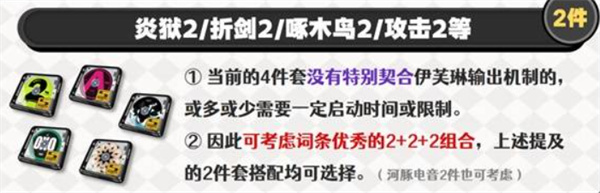 目前没有专门契合伊芙琳机制的4件套,因此可以考虑用副词条优秀的散搭来弥补。