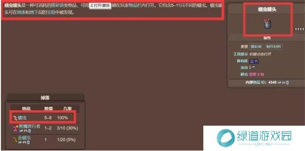 蠕虫罐头是一种可以消耗的摸彩袋类物品,通常可以在地表或地下的宝箱中找到。玩家可以开启这些罐头,约有5%的几率会掉落金蠕虫。