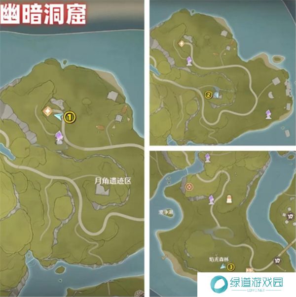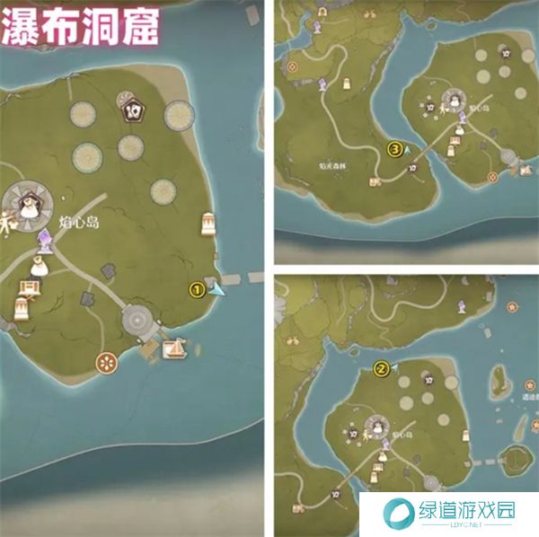 花焰群岛一共有4个洞窟,每个洞窟有三个烟花筒,唯有全部3个点燃后才能进入洞窟中,具体烟花筒位置参考下图: