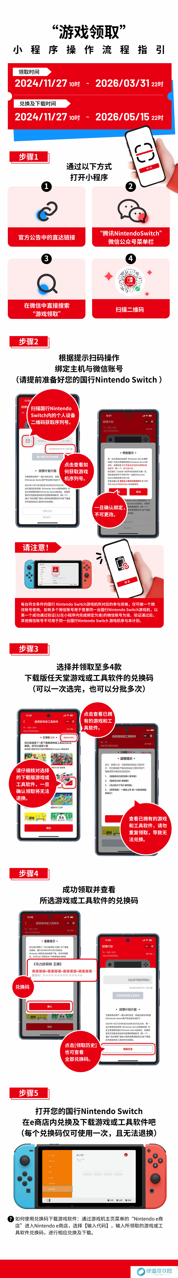 从2024年11月27日10点到2026年3月31日22点,凡是已经激活并按照《Nintendo Switch使用条款》正常使用的国行NintendoSwitch主机,其拥有者都可以通过绑定的微信账号(每台主机只能绑定一个账号)在“游戏领取”微信小程序里免费领取最多4款下载版任天堂游戏或工具软件兑换码。