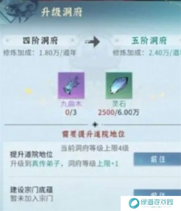 洞府升级:洞府可以提升自动吐纳灵气的速度,是提升修为的关键。升级洞府需要消耗九曲木和灵石。