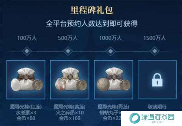 一旦全平台预约人数达100万、500万、1000万、15000万时,全服玩家都可获得额外豪华奖励,具体如下图: