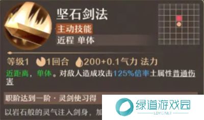 坚石剑法(主动技能):对敌人造成125%攻击倍率的土属性单体伤害。