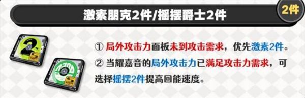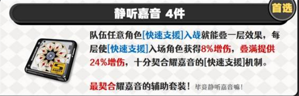 当快速支援的层数叠满时,耀嘉音可以获得24%的增伤加成。由于她的快速支援机制与四件套的效果高度契合,叠满增伤后可以大大提升她的输出表现。