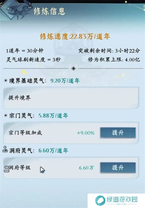 洞府灵气:洞府等级决定了修炼速度的加成,提升洞府等级可以极大增加修为产出。洞府升级需要消耗九曲木和灵石,因此前期一定要优先提升洞府,不可省略。