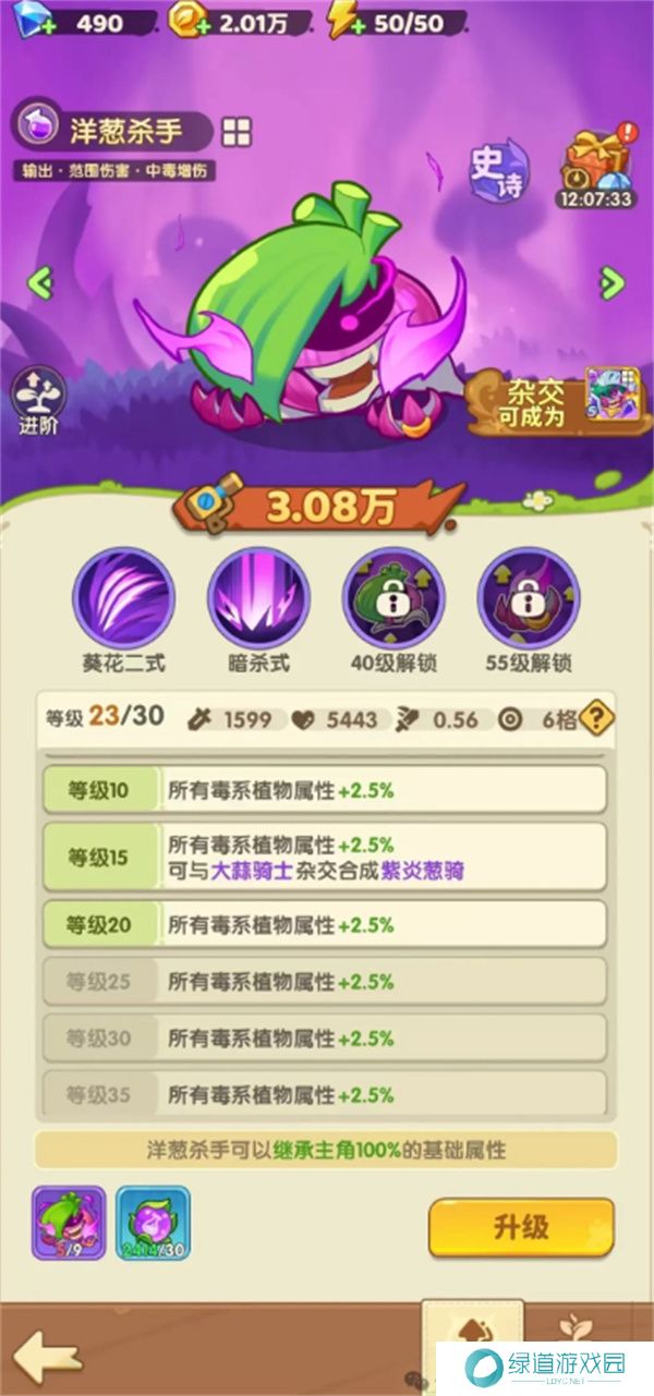 洋葱占格4格,并且继承主角的高攻击力,其基础攻击比其他紫卡植物要高。