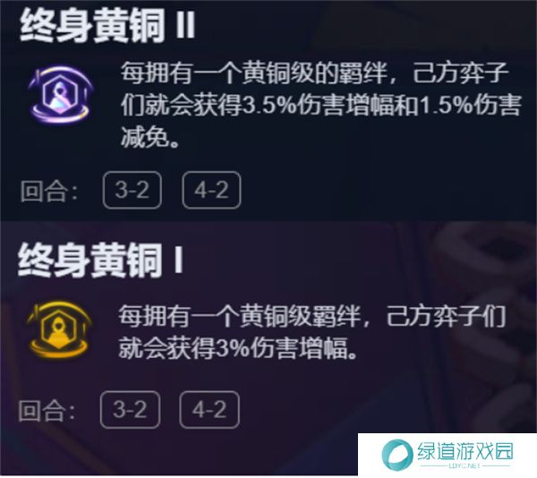 每拥有一个黄铜级羁绊,己方棋子将获得3.5%的伤害增幅和1.5%的伤害减免。