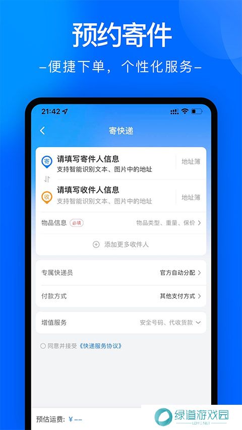 1、只需输入寄送地址和重量,系统会自动预估快递运费,透明清晰,方便预算。