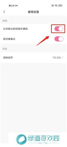 3、进入通用设置,点击【允许移动网络缓存漫画】右侧按钮开启。