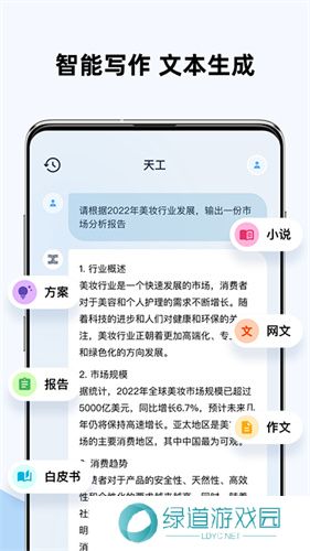 天工ai写作助手app是一款基于天工大语言模型打造的AI对话服务软件,可通过强大的语言处理能力轻松实现AI搜索、AI对话、AI阅读、AI创作等功能。其强大的互联网知识查询功能让其可以轻松做到上知天文下知地理的效果。对于写作领域的帮助则更加明显,天工ai能够轻松完成对场景的描写、对于策划案的创建、故事的设定、剧本的编写等等。只要你输入要求那么必定能有所回答。
