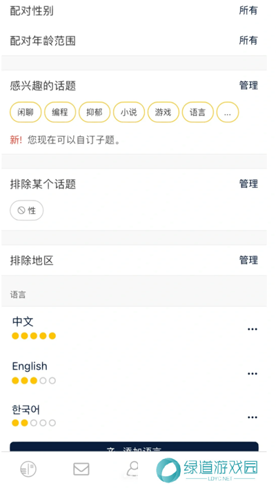 4、在设置里还可以设置配队性别、配队年龄范围;设置自己感兴趣的话题以及踩雷话题;设置地区及语言