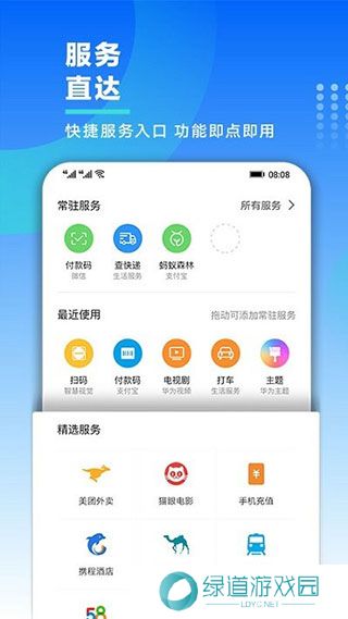 2、快捷服务入口,聚合生活服务、娱乐购物和实用工具三大类服务,能即点即用。