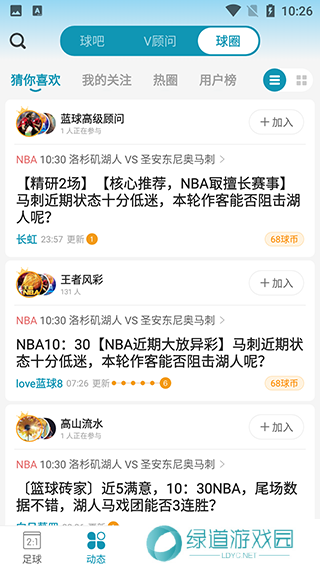 4、在动态栏里点击上方球圈,可以查看和加入各个比赛板块的讨论圈子。