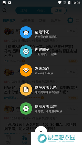 5、点击底部“+”可以发表自己的观点,包括创建球吧、创建圈子、发表话题观点等。