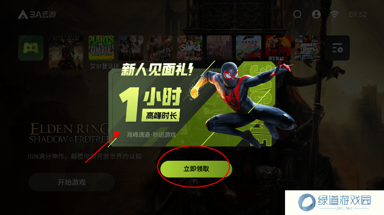 3、注册完成后,会赠送1小时高峰时长秒进游戏通道,点击领取。