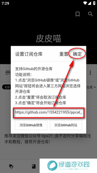 4、订阅仓库界面自动填入地址,点击右上角“确定”。