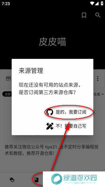 1、打开皮皮喵,点击“发现”,提示订阅第三方来源仓库,点击“是的,我要订阅”。