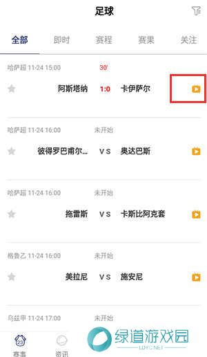 2、在赛事这里,有各种赛事直播,用户只需点击赛事栏的黄色播放标志即可播放;