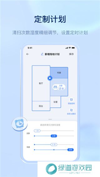 2、可选择清扫房间、清扫次数、拖地湿度等任务,针对不同使用场景,制定专属清洁方案。