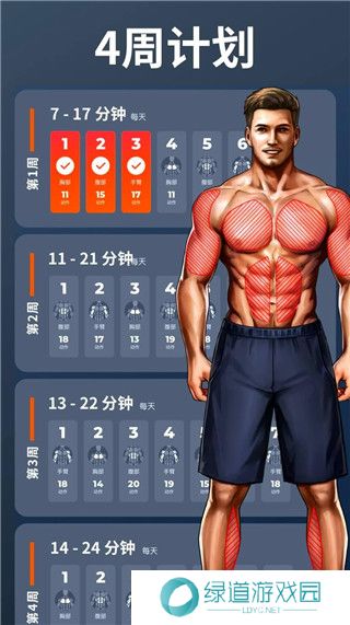 1、覆盖胸部、腹部、肩膀、背部、腿部等各个部分分享锻炼,从初级到高级选择健身。