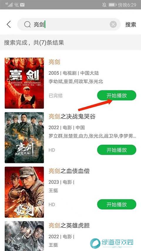 4、这里以亮剑为例,可看到出现相应的搜索结果,选择需要的内容点击【开始播放】选项;