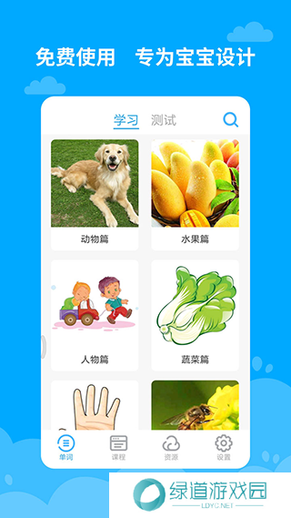 宝宝学英语app亮点1.常见的动物,水果,蔬菜,运动等进阶课程。