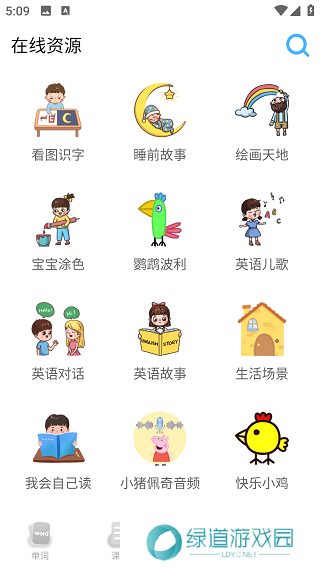 3、在“资源”中可以听睡前小故事、英语对话、宝宝涂色等项目。