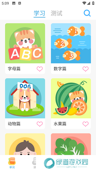 宝宝学英语app使用介绍1、点击进入app后可以看到字母篇、数字篇、动物篇等学习分类,还可以进行随堂测试。