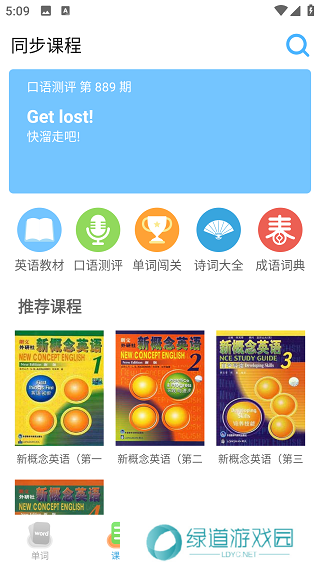 2、在“课程”中可以选择英语教材以及口语测评,还可以玩单词闯关。