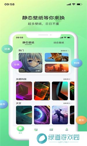 1、在主界面直接获取动漫、自然、美女等各种静态或动态的壁纸,直接下载保存即可。