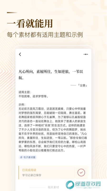 3、每一个素材,都提供了独家的用法解析和范例,看语言下次考试就能立刻用上。