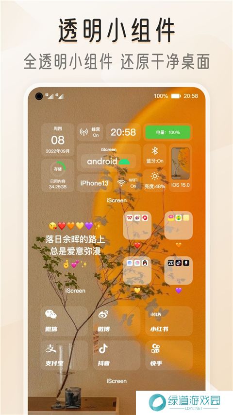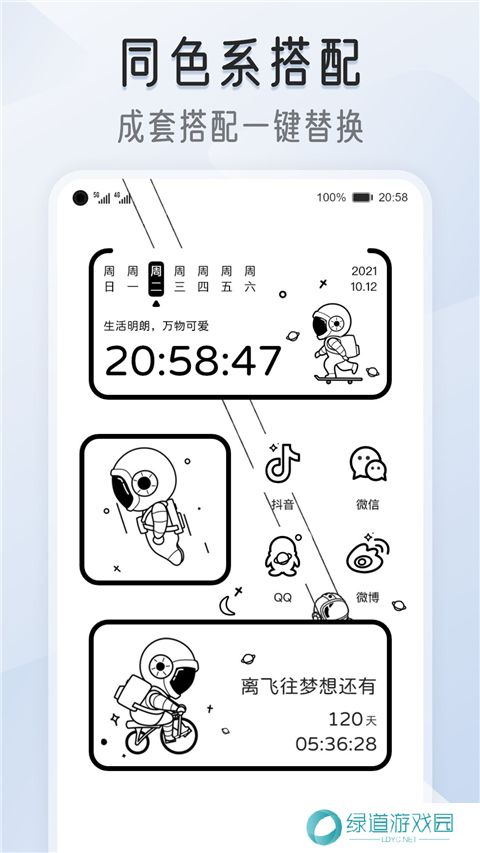 3、采用玻璃拟态、留白设计等小组件设计元素,手机桌面的定制自由、独特。