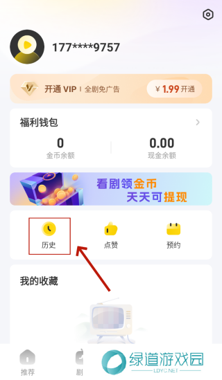 想要删除星芽短剧历史记录,就需要先完成手机号登录,之后,点击“历史”,进入“观看历史”界面。
