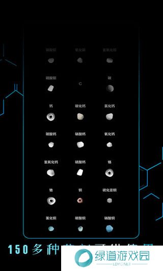 2、其中有近150种不同形态(气、液、固)的物质(或材料或试剂),这些物质均有汉语名称以及对应化学式显示,你只需要选中你心目中的那个丢进烧杯即可。