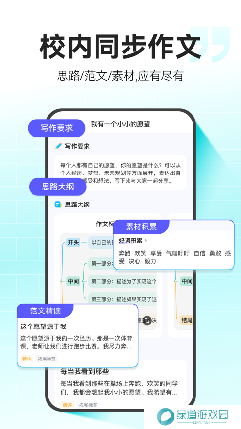 3、内置海量英语、语文作文素材和写作灵感,帮助学生更轻松地展开创作。