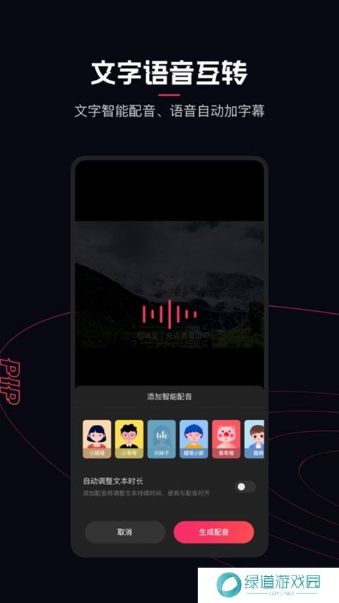 3、选择【智能配音】功能,根据对面的画面,我们输入要配音的文字,即可给我们的视频配音了。