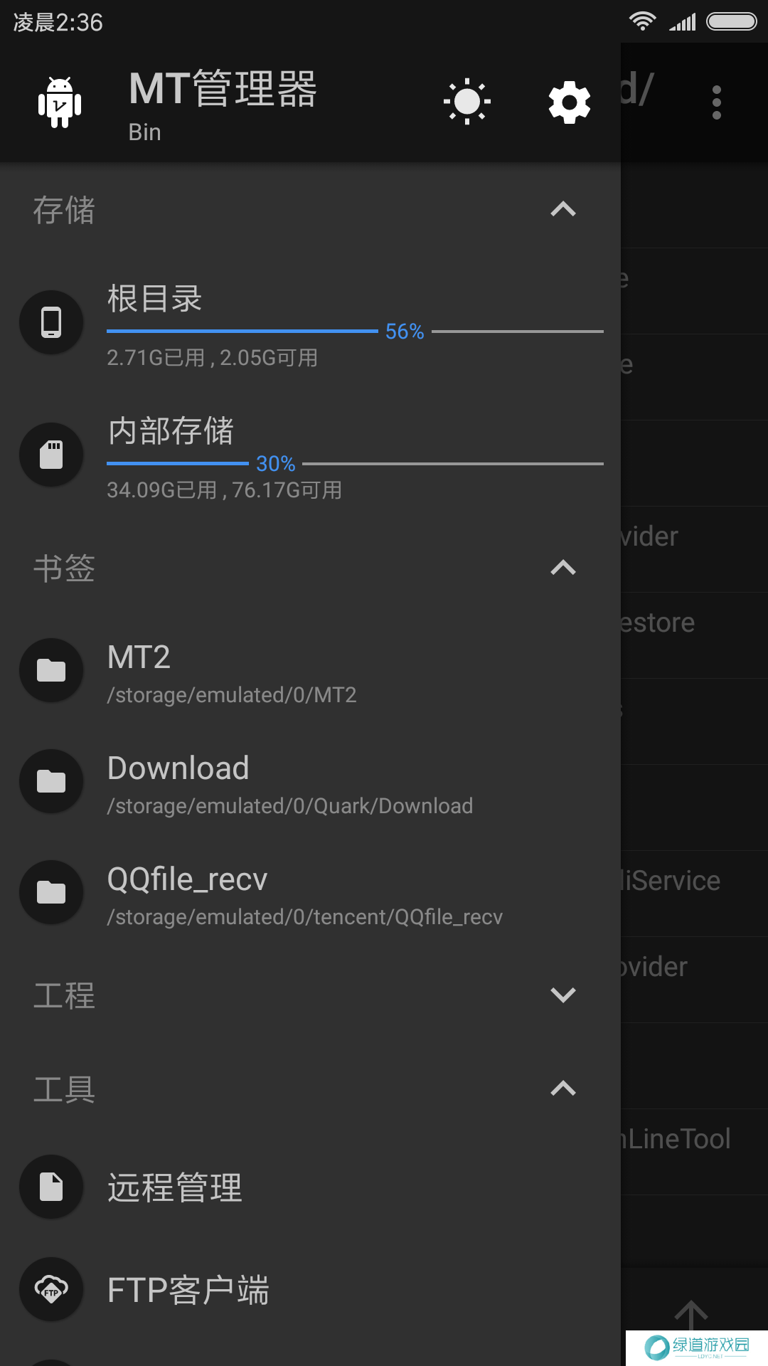 3、管理器mt设置操作侧栏,可方便查看存储设备、FTP连接、书签、后台、工具等。