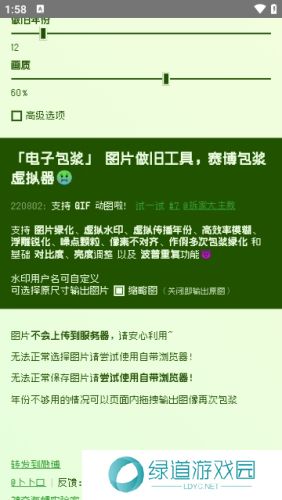 电子包浆生成器app是一款能够为用户带来很多趣味体验的手机图片编辑软件。相信很多人都听说过电子包浆,就是一张图片通过多次转发,逐渐呈现出绿色并模糊不清的效果,这款app就能帮助用户将图片做旧到不同程度,非常有趣,软件当中拥有多种功能,利用这些功能可以对图片的做旧程度进行把控,并对图片进行编辑,制作出很多有意思的图片,甚至可以弄成表情包哦。
