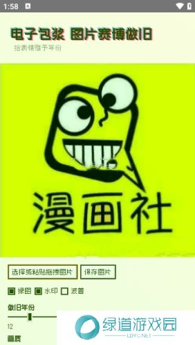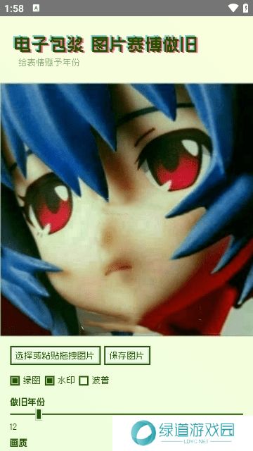 2、导入图片后,我们通过下方最基本的“绿图”、“水印”、“波普”等关键字可添加图片的细节,拖拽做旧年份、画质可达到更加好的做旧效果