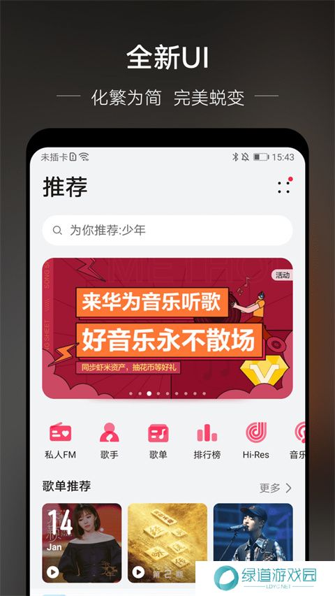 2、视觉风格全面焕新,首页更多个性推荐栏目,找最近喜欢的歌单、排行更方便。