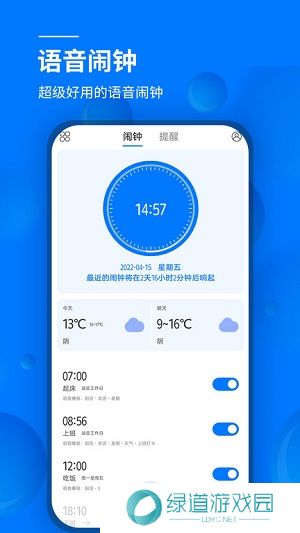 语音闹钟app是一款专为用户们打造的智能闹钟软件,在该闹钟中提供的强大功能,每天都会在平台当中提醒用户们进行各种的事项,让你不会有任何以往的风险。这种智能闹钟功能还可以去帮助用户们养成一个早熟早起的好习惯,以便能够让用户们在这里拥有一个更为良好健康的身体,并且都是完全免费使用的,不会有任何的使用难题。