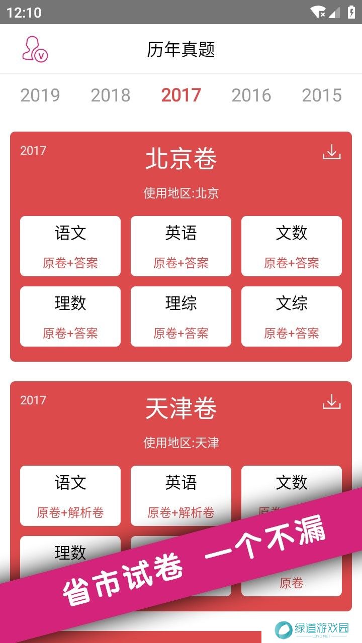 2、来到了主页面,这里有不同年份,不同地区的真题卷可以选择。