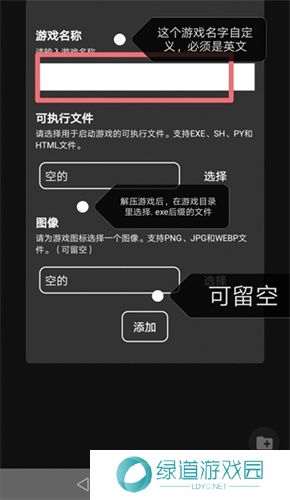 2、点击文件夹之后会出现一个界面,而界面中的name随便填,executablefile点CHOOSE选择安卓游戏的game.exe文件,Icon可以不用管也可以选择自己喜欢的图片,点击ADD完成。