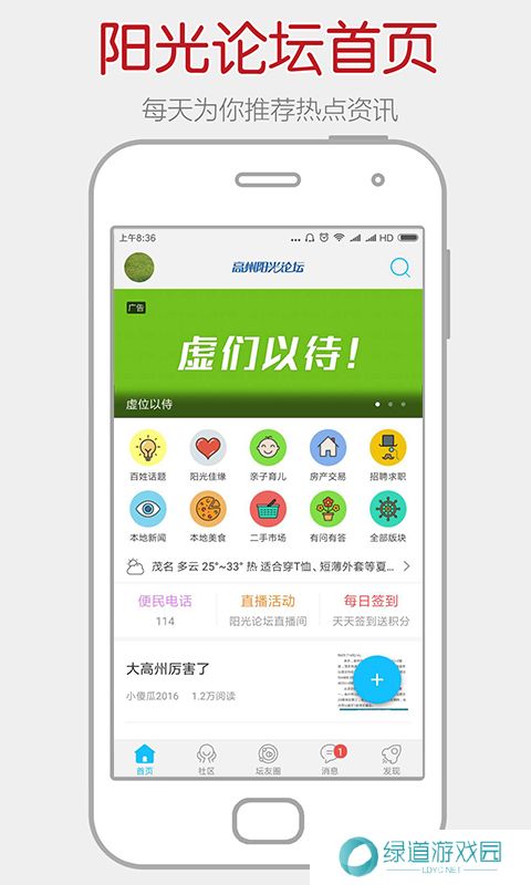 阳光论坛是一款面向高州本地人的手机社区软件,这是一款专属与高州人的网络社区,超多的本地用户汇聚在这里分享自己生活当中有趣的事情,也有超多的在线商家发布各种推销广告以及店铺优惠。也有超多的企业在线发布各种岗位的在线招聘,有需要的用户可以享受到最快捷的服务。用户还可以在这里认识到更多的同城好友,帮助自己寻找自己的另一半。